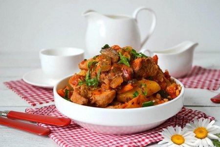 Tu auras besoin de: 300 ml de bouillon, 400 g de bœuf, 2 oignons, 1 poivron, 300 g de pommes de terre, 1 concombre mariné, 2 tomates, 3 c. huile végétale, 1 cuillère à soupe. pâte de tomate, 3 gousses d'ail, 3 petits pois, poivre noir, sel, herbes.