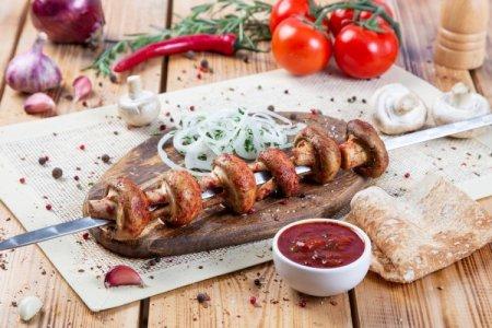 Préparation: Bien peler les champignons avec un pinceau et les faire mariner dans la sauce soja avec de l'huile, des épices et de l'ail écrasé pendant une demi-heure. Placer les champignons sur des brochettes plates et cuire jusqu'à ce qu'ils soient tendres, en les retournant toutes les 3 minutes.