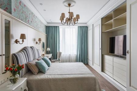 Si vous ne pouvez pas imaginer une chambre sans textiles luxueux, lustres et décorations luxueuses, envisagez une option de design classique. Il est préférable de choisir la couleur de finition parmi une palette laiteuse, olive ou lilas - ces couleurs iront bien avec les moulures en stuc, les lustres en cristal, les motifs de décoration dorés et, bien sûr, les meubles en bois coûteux aux motifs sculptés.