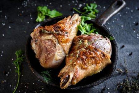 Préparation: Coupez la dinde en portions et roulez-la dans les épices. Hacher grossièrement les pommes de terre, mélanger avec du beurre et mettre le tout dans votre manche. Ajoutez-y l'ail, les herbes hachées et les herbes et faites cuire au four pendant environ une heure à 180 degrés.