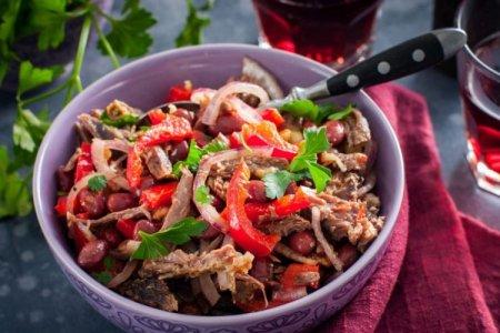 Préparation: Couper l'oignon en plumes et faire mariner dans du vinaigre et de l'eau. Faites bouillir la viande jusqu'à ce qu'elle soit cuite, coupez-la en lanières et ajoutez-y des lanières de poivre. Enfin, ajoutez l'oignon et les noix hachées, et assaisonnez la salade avec du yaourt.