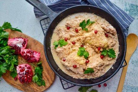 Hacher finement et faire revenir l'oignon, et hacher les noix avec l'ail et les épices dans un mélangeur. Mélangez-les ensemble, versez le jus de grenade et environ 500 ml de bouillon, et laissez mijoter 15-20 minutes à feu doux. Placer le poulet dans le satsivi.