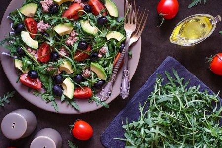 Préparation: Déchirer la roquette avec les mains, couper les tomates en deux, hacher l'avocat et arroser de jus de citron. Faire revenir les crevettes avec l'ail haché. Mélangez les aliments, ajoutez les noix, le sel, le poivre et l'huile.