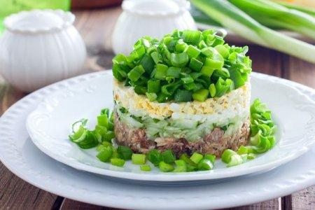 Préparation: Battez les œufs avec le lait et les épices, faites frire une fine omelette et hachez-la. Écrasez les aliments en conserve, hachez finement les œufs durs et mélangez la salade avec les oignons verts hachés. Assaisonnez-le de mayonnaise.
