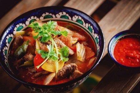 Tu auras besoin de: 1 kg d'agneau, 3 pommes, 2 poivrons doux, 3 tomates, 2 oignons, 1 carotte, 350 g de pommes de terre, gousse de piment fort, 0,5 c. cumin, 0,5 c. coriandre moulue, 15 g de sel, un demi bouquet de coriandre, 3 litres d'eau.