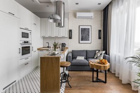 Une cloison étanche entre la cuisine et le salon empêchera les odeurs de se propager avec une hotte faible. Et la structure en verre entre la salle à manger et le balcon offrira une lumière naturelle et des vues panoramiques.