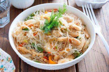 Préparation: Couper le poulet en morceaux et faire bouillir pendant 15 minutes. Hachez finement l'oignon, coupez les carottes en rondelles et le poivron en lamelles.