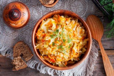 Préparation: Coupez le chou en petites lanières. Faire revenir les oignons hachés avec les carottes jusqu'à ce qu'ils soient dorés, verser les aubergines en dés et cuire jusqu'à ce que l'humidité s'évapore. Ajouter le chou, après 10 minutes ajouter la pâte de tomate, l'eau et le poivre moulu. Tomi 15 minutes, saler et éteindre.